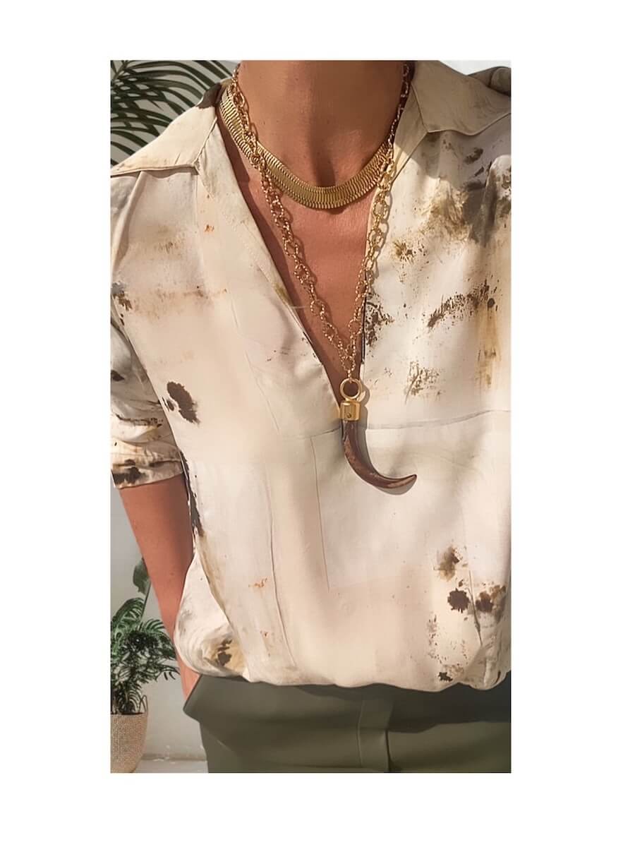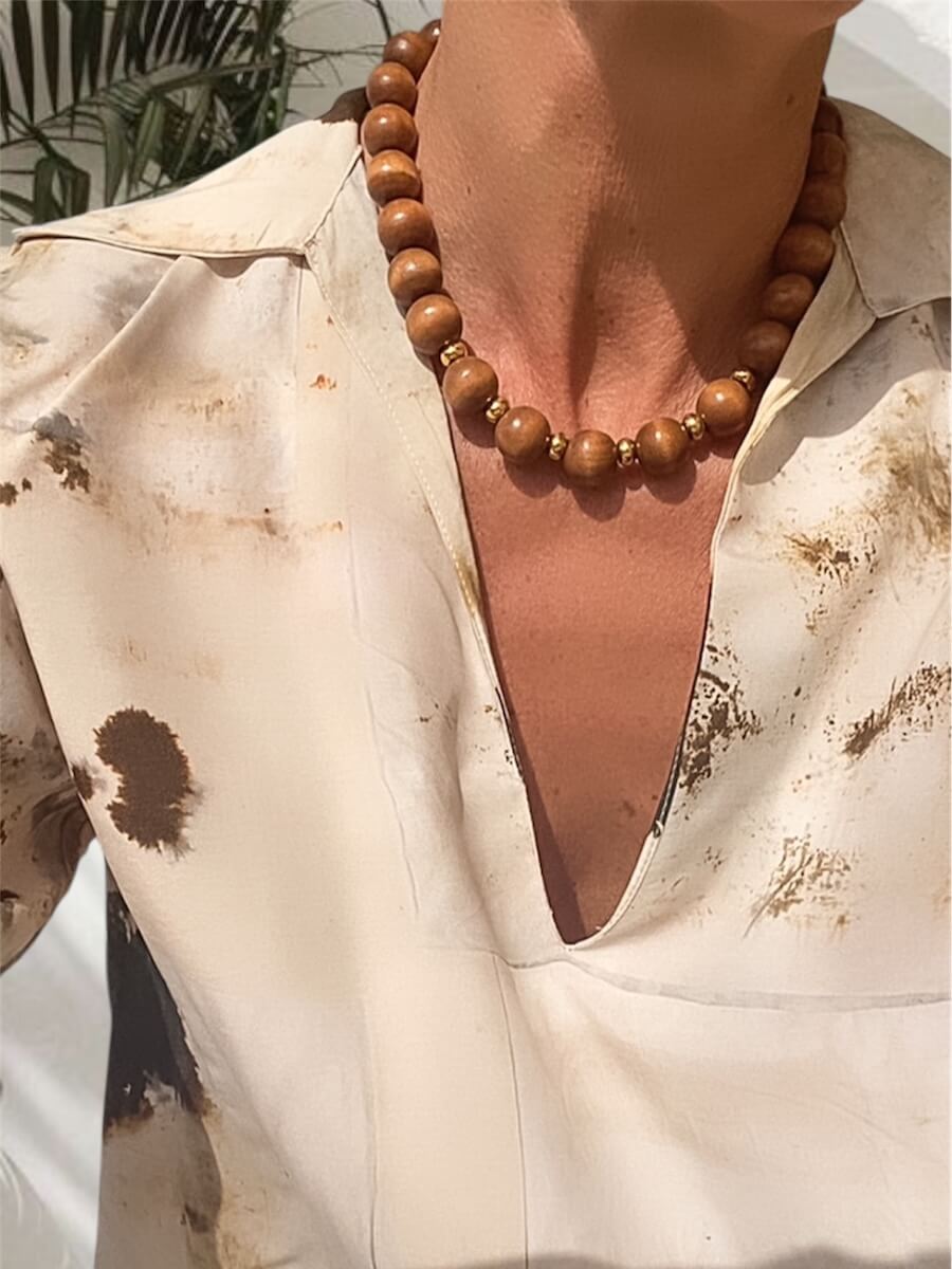 This necklace duo pairs bold metal with natural textures — featuring a layered gold chain set adorned with a striking thooth-shaped pendant, alongside a lightweight wooden bead necklace that adds a soft, organic balance. Worn together or separately, they create a look that feels both powerful and effortless — luxurious with a touch of wild serenity.